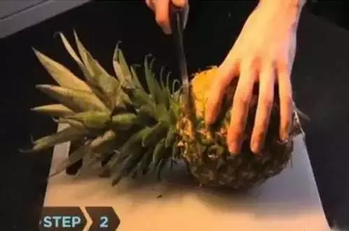 第二步:從葉叢與菠蘿交界處切開,不帶果肉。