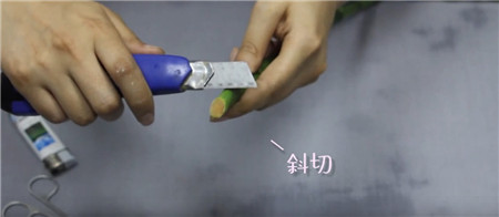 第二步:處理莖端,把莖端斜切之前,先用打火機烤一下刀片進行消毒,切口呈馬蹄狀,可以增加切口與水的接觸面積,利于吸收水分。
